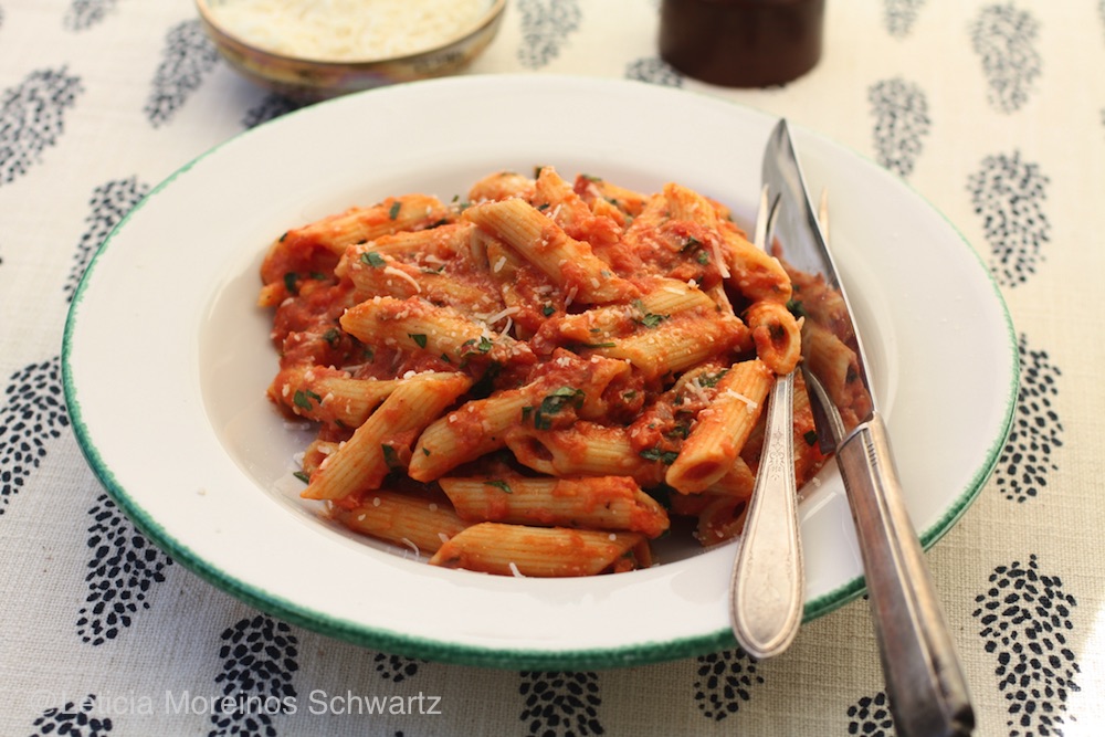 5- Add the pasta and fold into the sauce. Season to taste with salt and pepper and finish with parsley and parmesan. Transfer to warm bowls and serve hot.