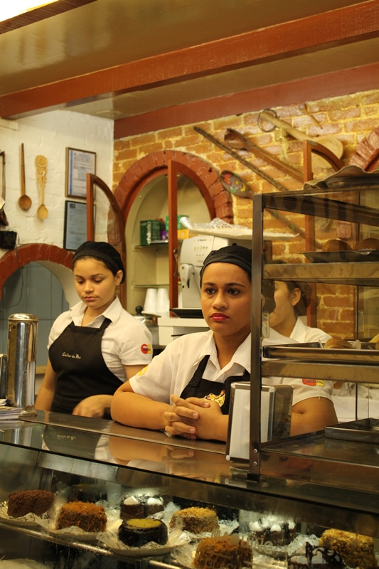 Colher de Pau’s kitchen is full with busy women. While one is arranging a box of Brigadeiros, another is serving empadas. Others are preparing sweets back in the kitchen. Each of these sweets is labor intensive. Most of these cakes are so traditional, so unalterable, that they can be challenging for the home cook to prepare.