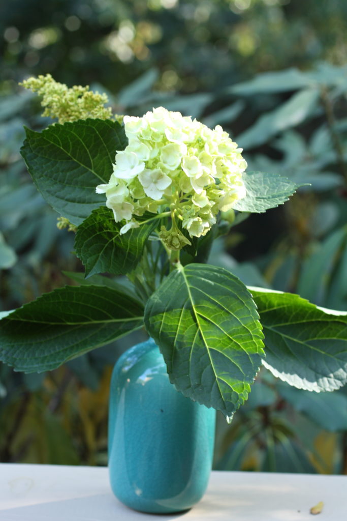 The vivid turquoise of this vase brings the right look for this white hydrangeas;